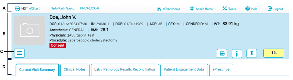 • A: The eChart Toolbar – The toolbar is always present at the top of HST eChart. Tapping the HST eChart logo on the left-hand side will take the user back to the HST eChart Home Page to whichever tab they were last viewing. The user’s name and Center name are displayed next in the toolbar. On the right side of the toolbar are Home, Admin, Help, and Logout buttons. If the user has access to more than one center, hovering over the center name will show other centers. To navigate to a different center, the user can click on the name of that center.