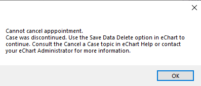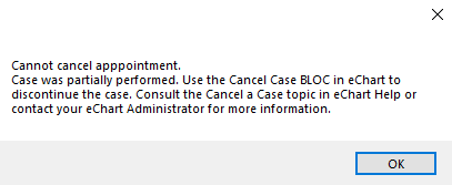 If a Pre-Op room in time has been documented for a case, then the case must first be cancelled in HST eChart before it can be cancelled in HST Practice Management. If a user attempts to cancel a case in HST Practice Management before it has been cancelled in HST eChart, the following message will appear in HST Practice Management: